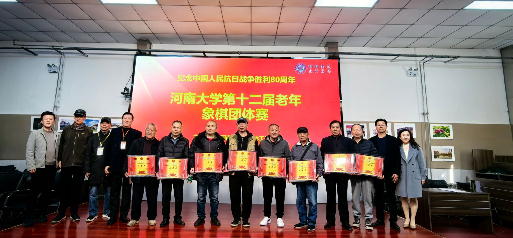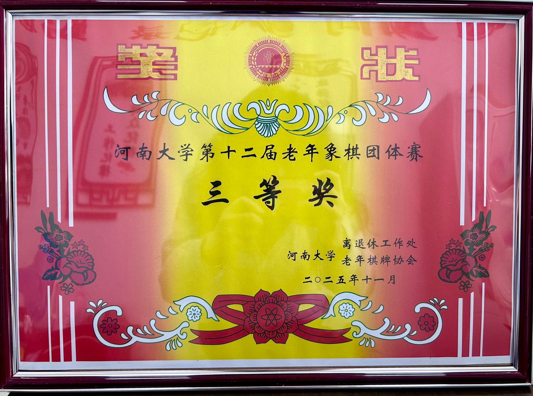 由离退休工作处和老年棋牌协会共同举办的2025年河南大学第十二届老年象棋团体赛,于11月4号上午在明伦校区离退休工作处一楼多功能厅拉开帷幕,基建处退休教工杨金玉、郭瑞民、贾二元、赵新民四位老师以团体形式参加比赛,并斩获团体三等奖佳绩。